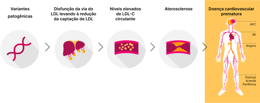 As variantes patogênicas causam disfunção na via do LDL e reduzem a remoção do LDL-C do sangue, levando a aterosclerose precoce e complicações cardiovasculares1,3-5
